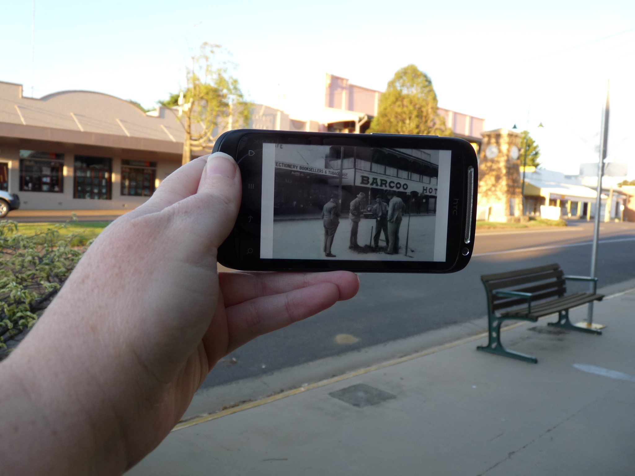 After reading Ewen’s diary post about attending the ABC Open Now & Then workshop I decided to have a go at it while on a work trip to Blackall. The idea is to take an old image and photograph it in its original position. Because I was on the road I couldn’t print any of the photos so tried it with my mobile instead. Using the internet feature I looked up photos of Blackall on Picture Queensland and found this great one where four men were testing the soil quality for planting trees outside the Barcoo Hotel in 1941. Looking at the trees in the new photo the soil must have passed the test!