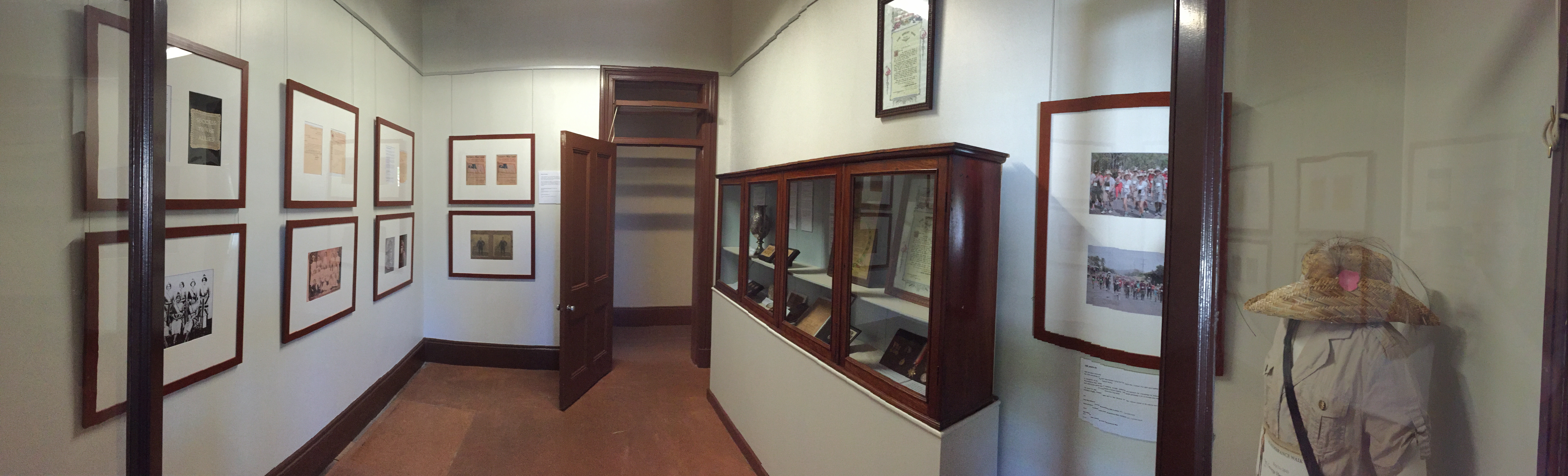 Changes to the project meant that Ewen and I also had to make adjustments. The alternative gallery space meant Ewen had to install a new hanging system and different types of framing mounts and matts were required. By coincidence, Cooktown’s timber honour board, already on the display, is located outside the gallery. This, and a poster created to promote the exhibition, created a nice entry to the gallery. I had to remove some photos and posters from damaged frames for conservation and display purposes. I also made a range of different mounts and object supports, and generally extended my sewing skills! Of course, label making is always a feature for this type of project, but I can advise that the degree of difficulty definitely increases as the temperature and humidity rises!