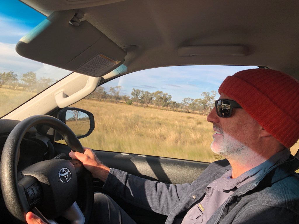 From St George we headed west to Cunnamulla in the Paroo Shire, home to Slim Dusty’s Cunnamulla Fella. Ewen has perfected the layering technique required to stay warm despite the sunshine, sporting the combo of beanie plus sunglasses to fulfill both warmth and glare requirements.