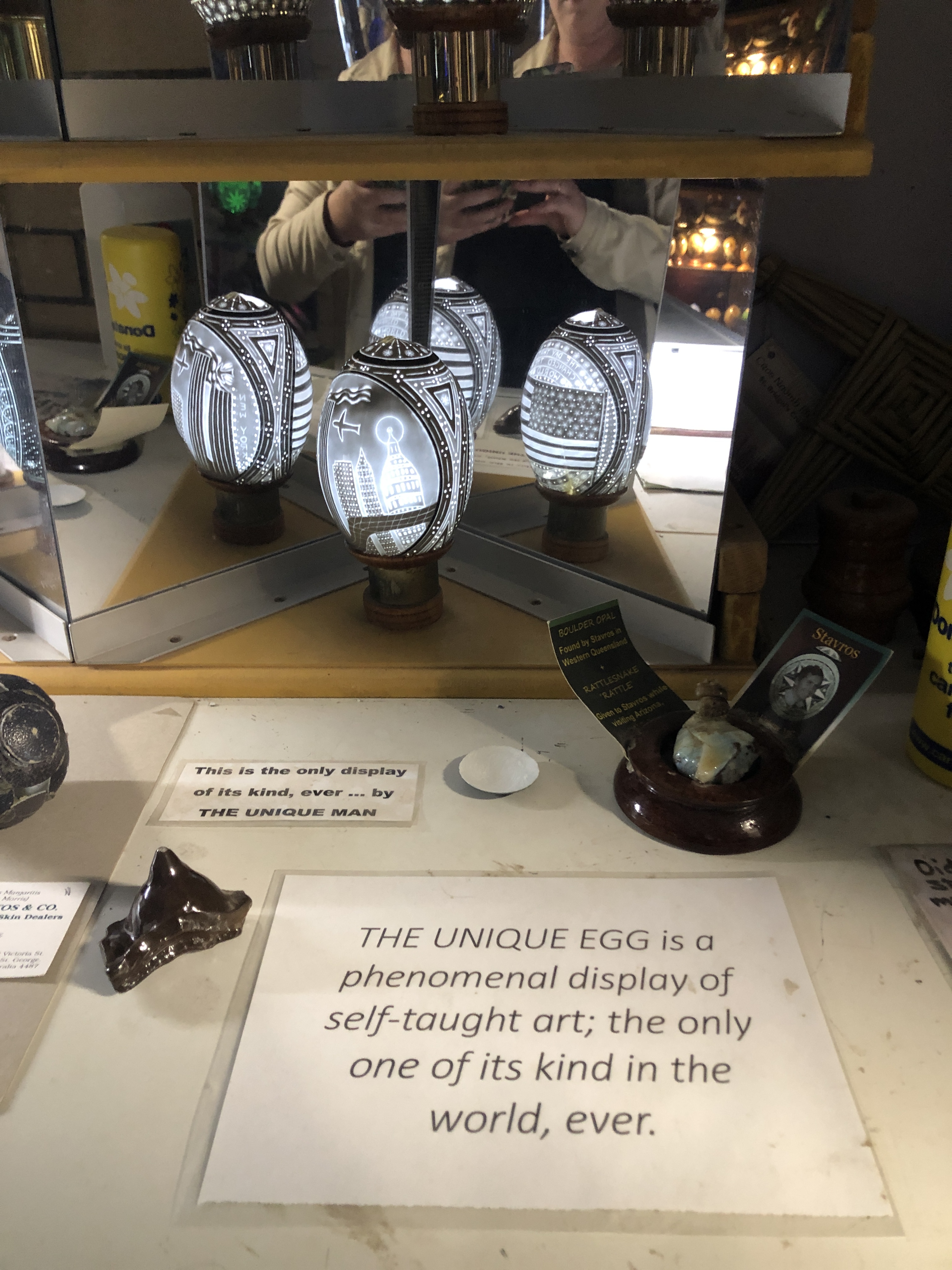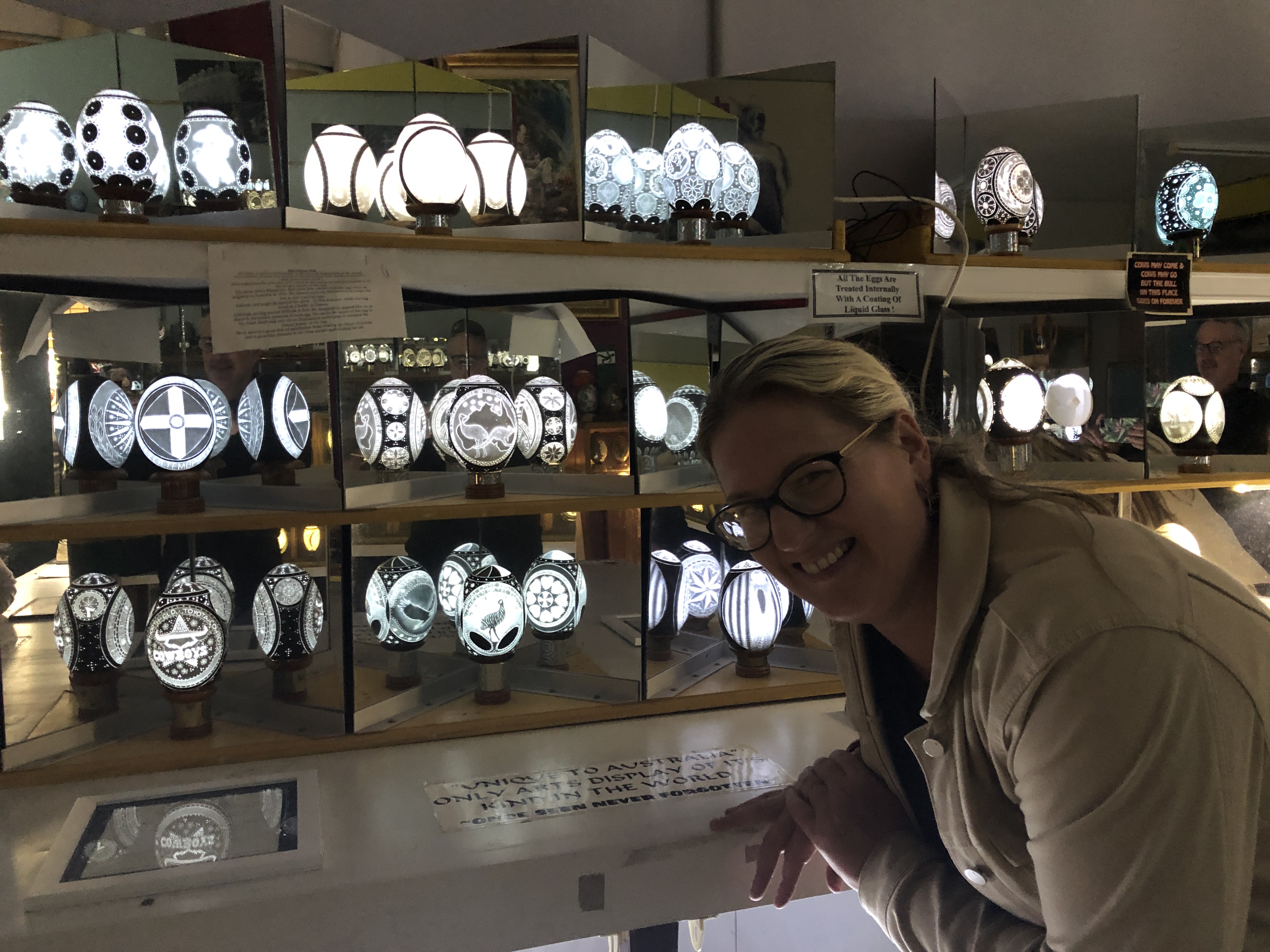 After a catch up with the friendly team at the Visitor Information Centre and finding out a bit more about some of the cotton growing that powers this region, we wandered to a St George icon – The Unique Egg. Run by Stavros (Steve) Margaritus and his daughter, The Unique Egg displays Stavros’ incredible emu egg carving skills, which he picked up after moving to St George from Greece in the 1950s. Now in his late 80s we enjoyed meeting the artist himself.