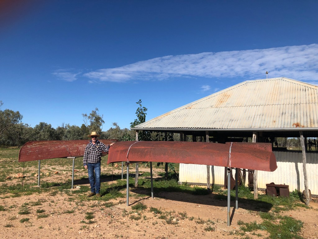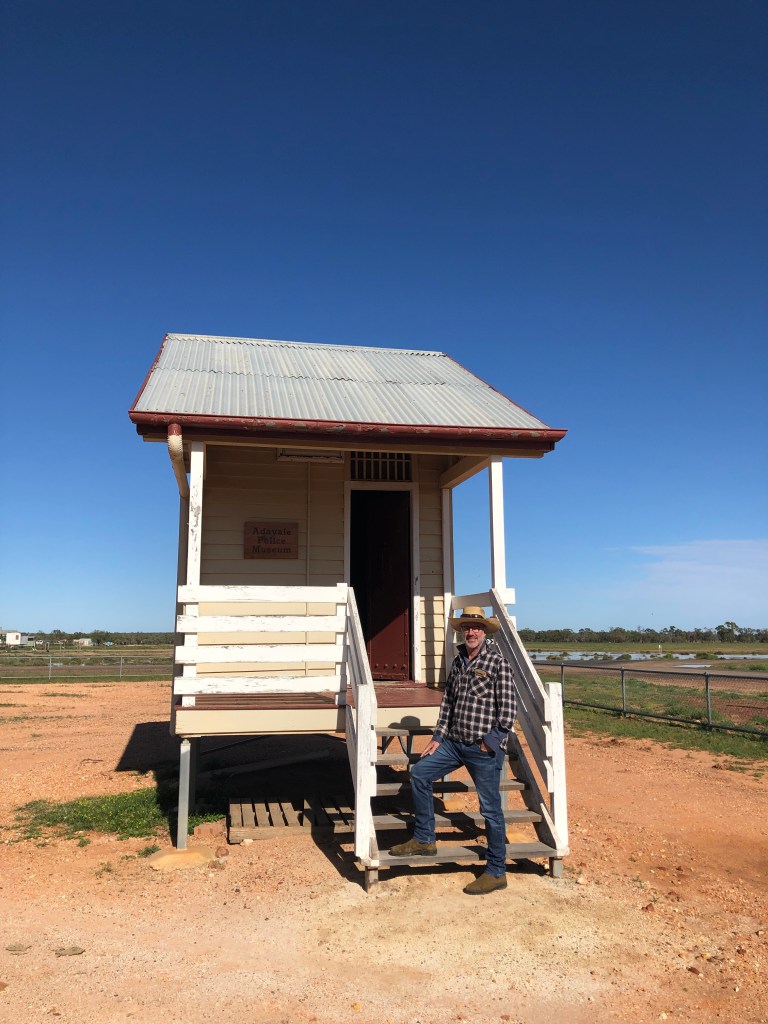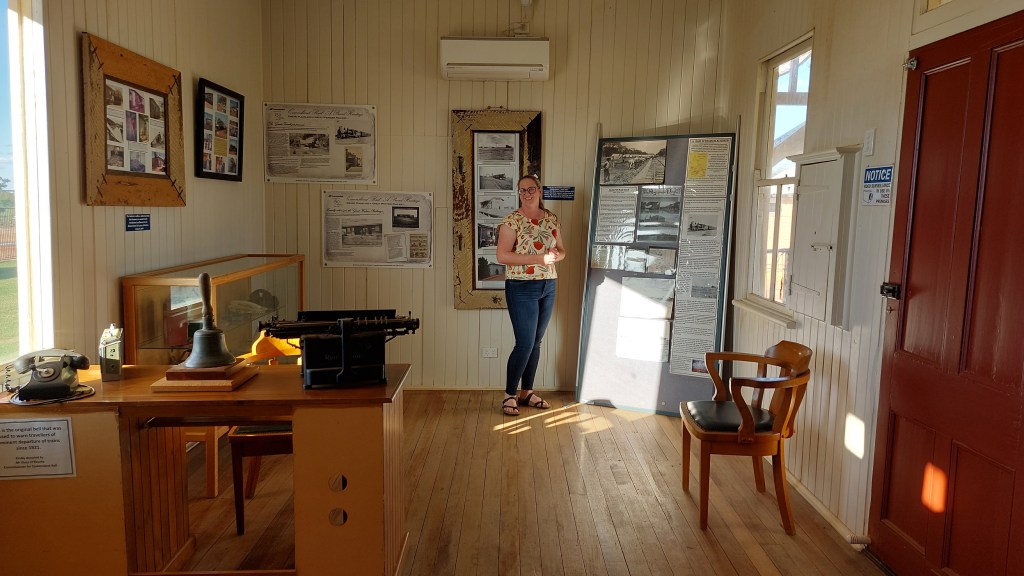 From The Lake we headed into Quilpie proper, where we met with Karen and Jess at the Quilpie Visitor Information Centre. The Quilpie Council manages a number of sites around the Quilpie Shire, including the Railway Museum and Quilpie Museum in town, and the Adavale heritage precinct. They also assist with the Eromanga Living History Museum which we will get to later! Ewen was blown away by the work Jess had done in the Quilpie Museum after he and Mel visited a number of years ago. The space is now arranged by theme, with amazing photographs framed in a way that allows easy changeover, and objects which help to share the local stories from the Shire. While on site we worked with Karen and Jess to move the Railway Museum’s original station bell and lantern into a display case and talked through some options for other projects in the area.