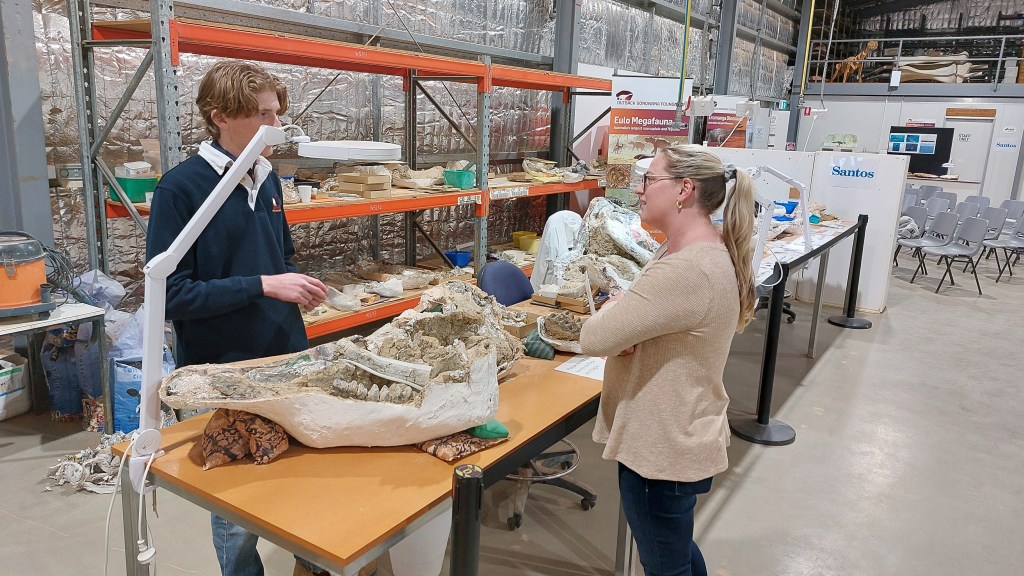 After a restful night in Quilpie, we headed off to Eromanga, home of Australia’s largest recorded dinosaur – Cooper, Australotitan cooperensis, thought to have been 30 metres long! The Eromanga Natural History Museum has been a project a long time in the making, since 14 year old Sandy Mackenzie discovered an unusual rock just outside the town of Eromanga in 2004. The ‘rock’ turned out to be part of a fossilised dinosaur, and since then the team have unearthed many internationally significant dinosaur remains, as well as creating a stunning museum experience for visitors and an incredible laboratory set up for fossil preparation and research work. We were very lucky to hear about the museum’s journey of development from Robyn, Corey and Jo, and loved meeting more of the team as part of the guided tour.