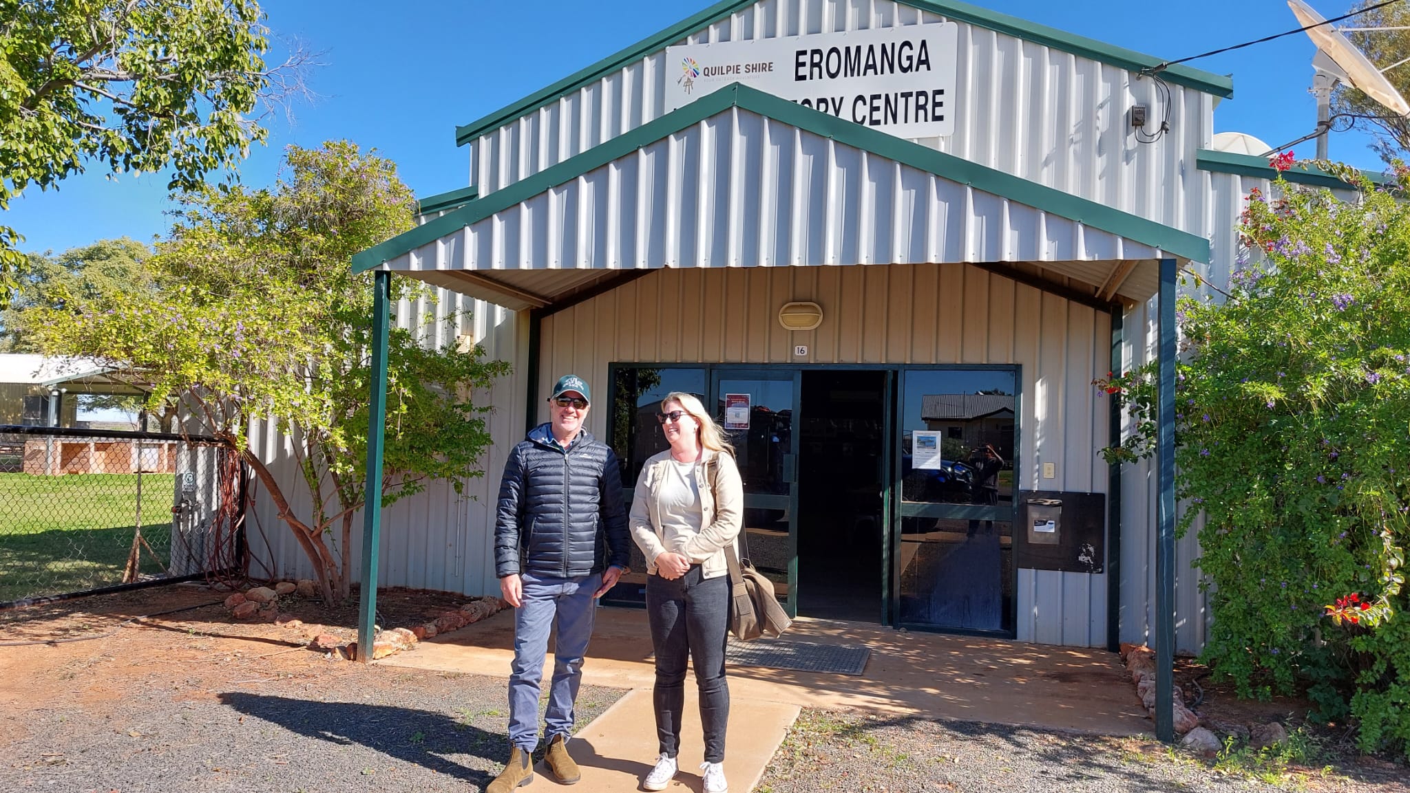 From The Lake we headed into Quilpie proper, where we met with Karen and Jess at the Quilpie Visitor Information Centre. The Quilpie Council manages a number of sites around the Quilpie Shire, including the Railway Museum and Quilpie Museum in town, and the Adavale heritage precinct. They also assist with the Eromanga Living History Museum which we will get to later! Ewen was blown away by the work Jess had done in the Quilpie Museum after he and Mel visited a number of years ago. The space is now arranged by theme, with amazing photographs framed in a way that allows easy changeover, and objects which help to share the local stories from the Shire. While on site we worked with Karen and Jess to move the Railway Museum’s original station bell and lantern into a display case and talked through some options for other projects in the area.