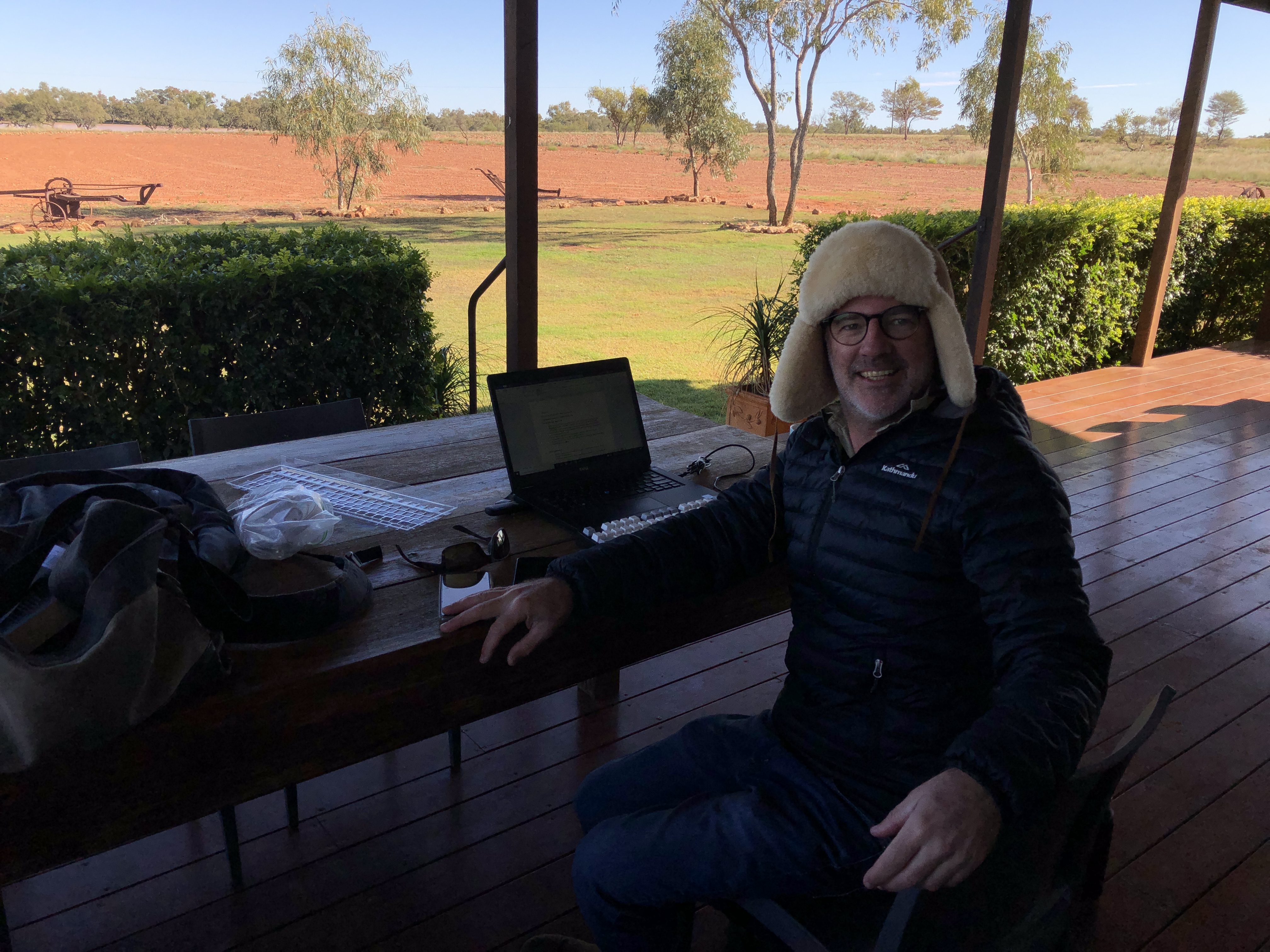 For our first night in Quilpie we stayed at the Shearer’s Quarters at The Lake, a cattle and goat property. The owners recognised the need to diversify during long-running droughts and set up some truly lovely accommodation, including a top-notch MDO office on the verandah. A little bit chilly in the early mornings but the view was well worth it.