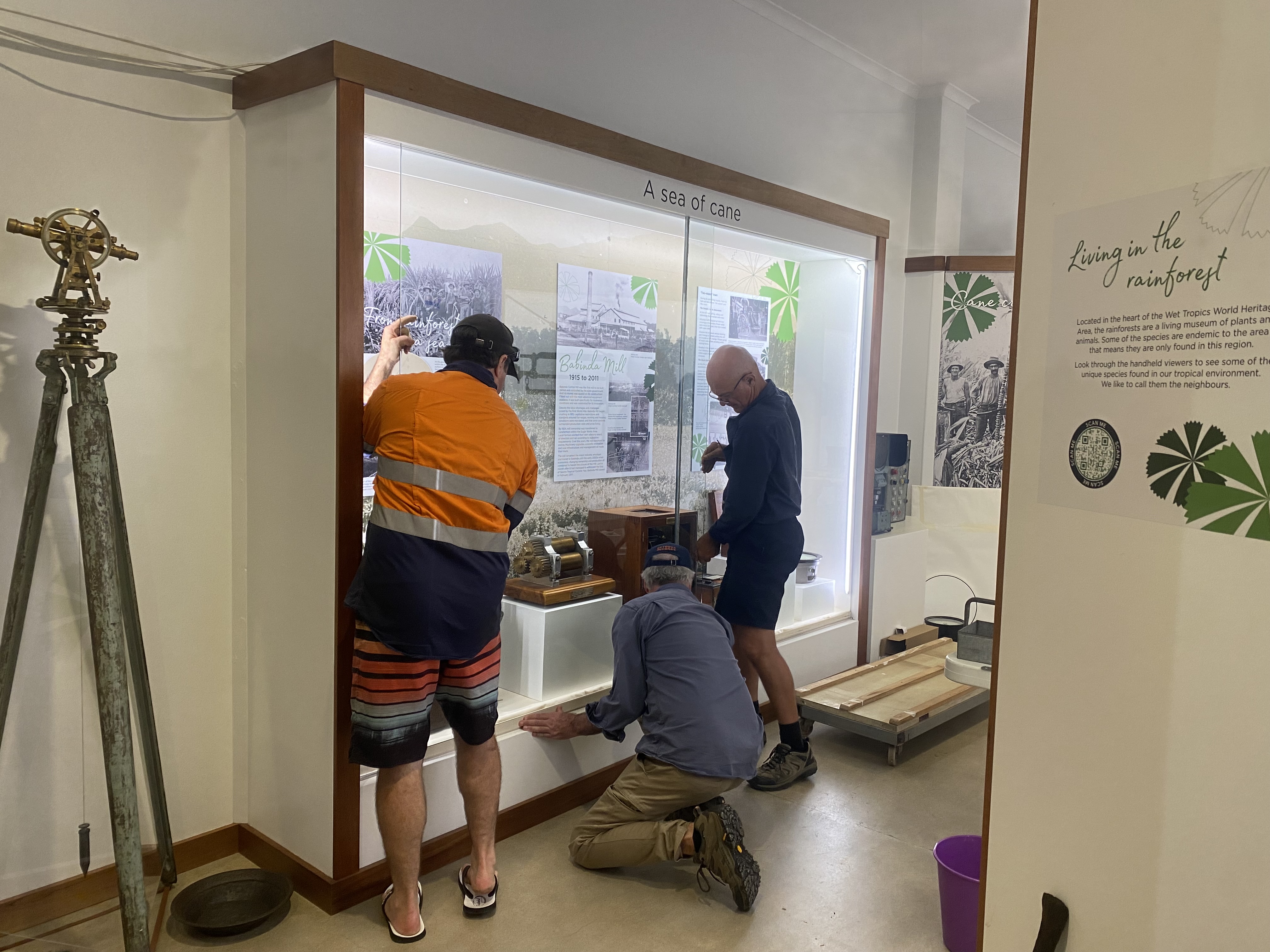 In January 2023, it was time for installation. Wanjuru-Yidinji Bama performed a smoking ceremony before the objects they made were installed in the case. Our team included all 10 museum committee volunteers, MDO Ewen McPhee and myself, and together we raced towards the opening. In between me repeating my “less is more” mantra and the groans from the team as they tried to sneak things in, the work was fulfilling and museum filled with laughter.