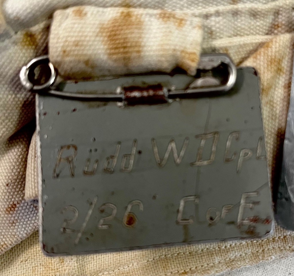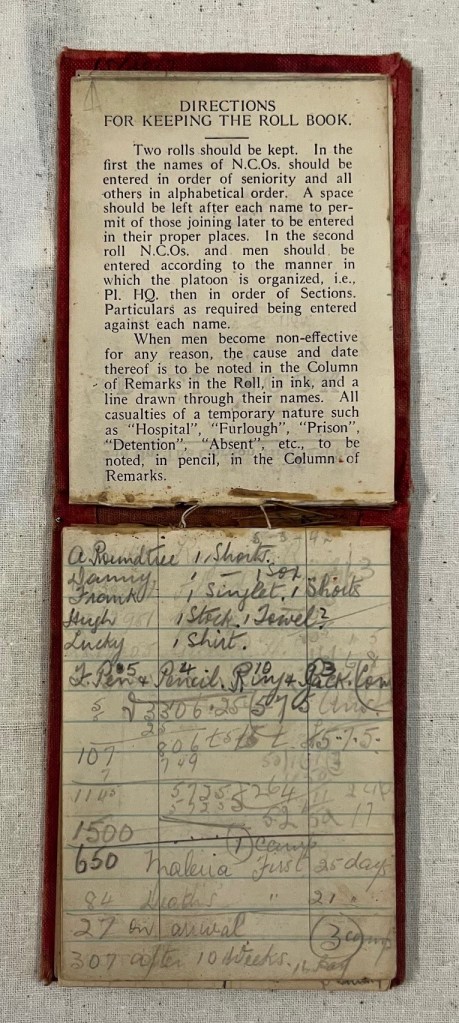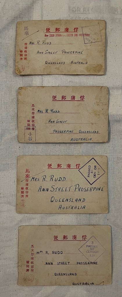 The highly personal objects include a pair of shorts made by his friend out of parachute material with a belt buckle and an engraved identification tag made from the wreckage of a plane. William’s Roll Book is also in the collection and is completely filled with notes and annotations. There is also a series of cards written by William home to his mother in Proserpine.