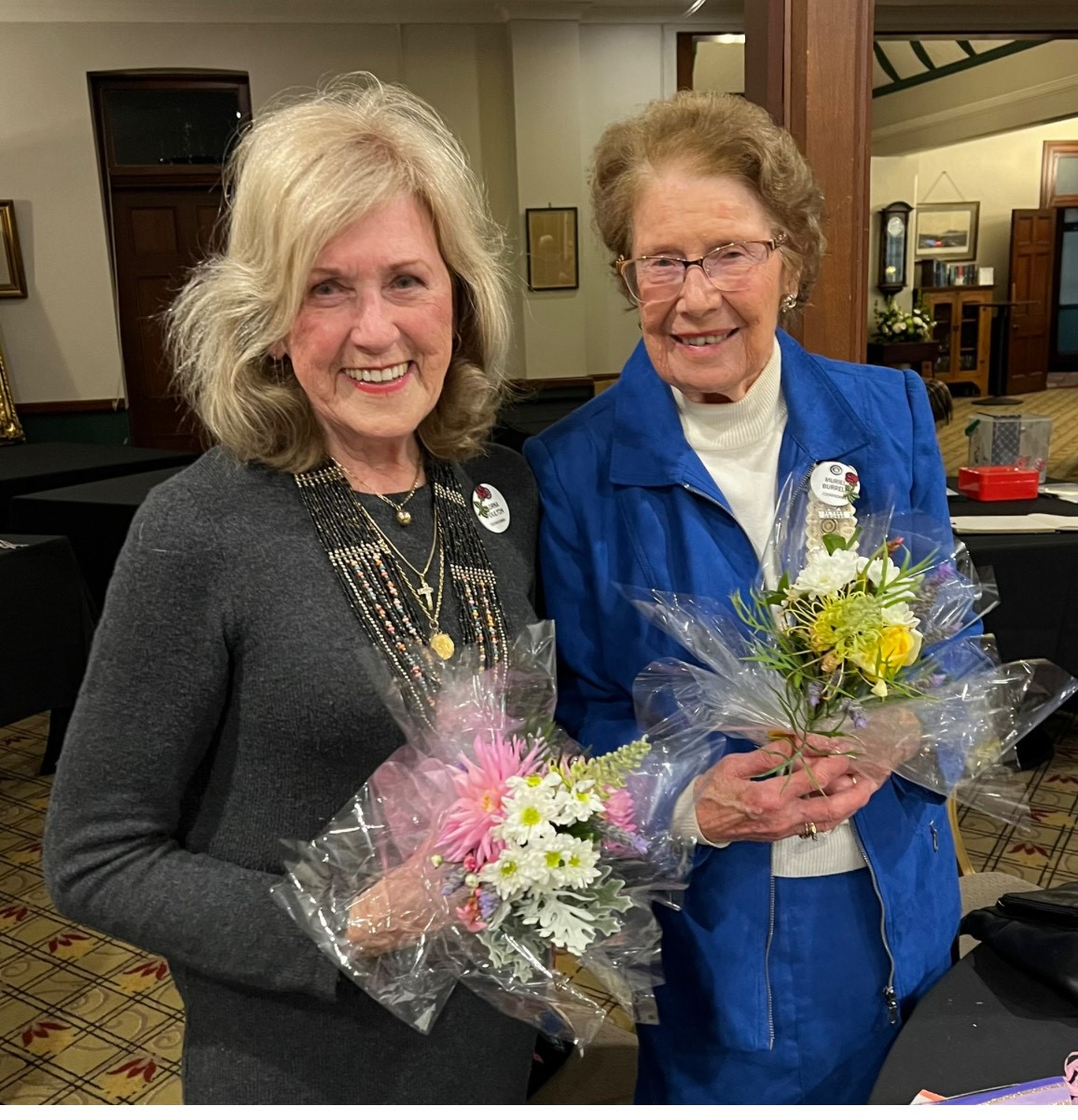 Between identifying charities to financially support and gathering synthetic wool to knit beanies for people-in-need, the Inner Wheel should be extremely proud of the support and selfless acts they carry out to support their community in Toowoomba. Being a part of a club that generous surely feels rewarding, therefore, it was no surprise that during the evening not one, not two, but THREE women were presented with a bouquet (made by a member), party hats, and a certificate to symbolise their 40th year in the club! Pictured below – left, Lorna Poulton, right, Muriel Burrell.