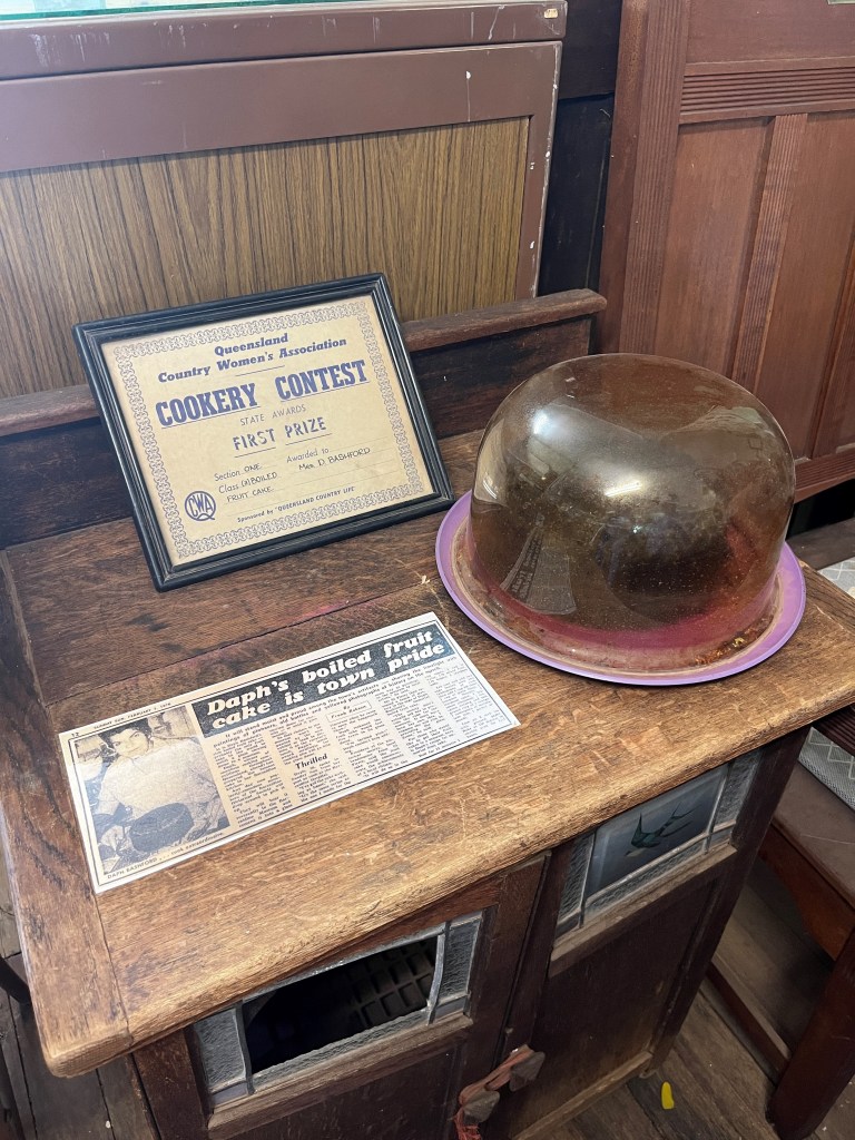 Showcasing the history of the Barcaldine district within the old National Bank building are items from local properties, households, and businesses. My favourite by far, however, is Daph’s boiled fruit cake, baked in 1976, memorialised in a glass dome.