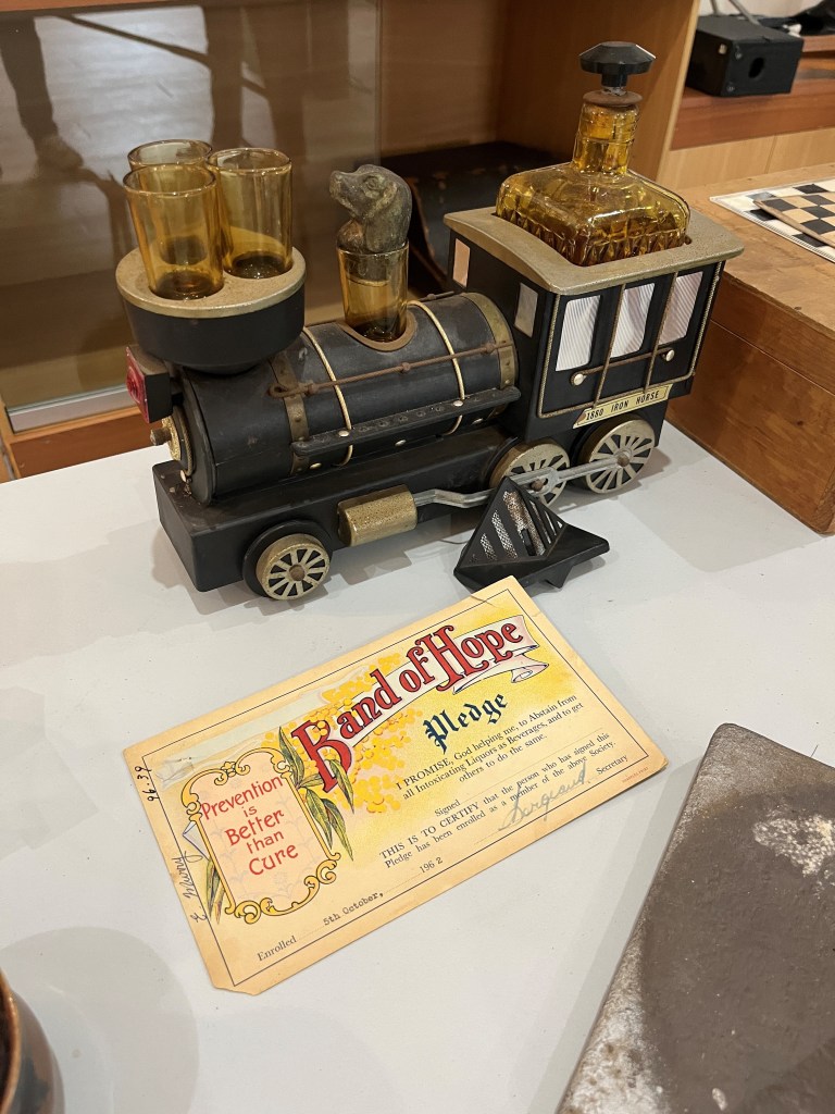 Not only is it quirky – and well placed next to the Band of Hope pledge to ‘abstain from all intoxicating liquors’ – but it is also a clever nod to the steam engines and large machinery on display outside the exhibition space. On the lawns of Clermont Museum, you can see the Aveling and Porter steam traction engine, used to relocate the entire town of Clermont to higher ground after the 1916 flood.